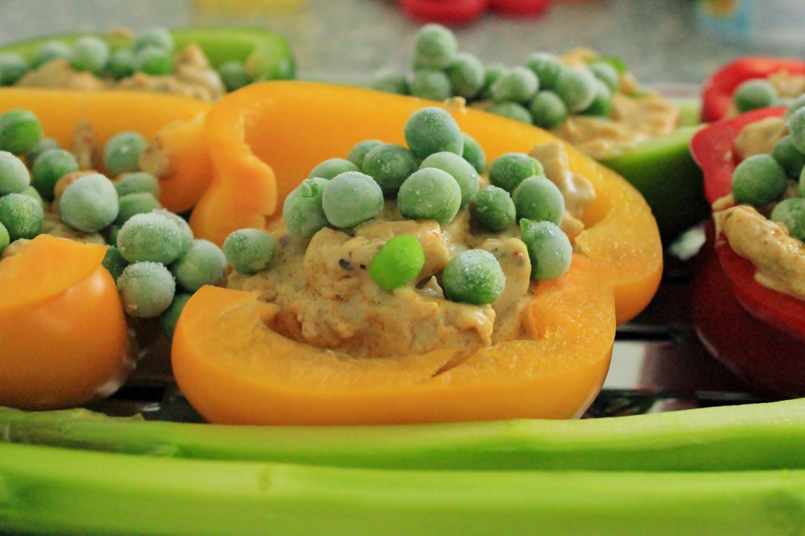 Täytä paprikat kanakastikkeella ja laita mukaan muutama pakasteherne, jos haluat. Kuorruta juustolla.